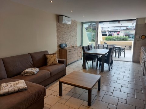 Eenmaal binnen hebben we de leefruimte, deze is voorzien van airconditioning.