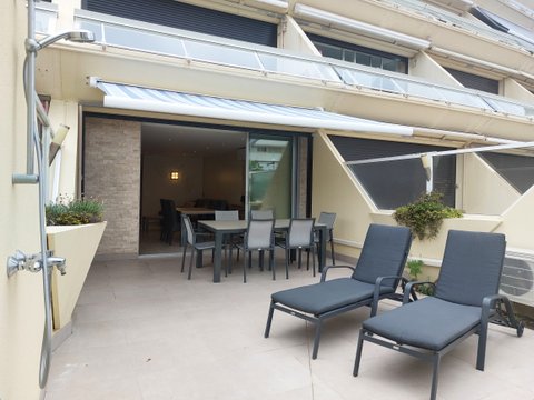 Een luxe appartement met een enorm terras (zon van 's ochtends tot de late namiddag) voorzien van een verwarmde buitendouche zodat U zandvrij binnen kan stappen, zijdelings voorzien van glazen windschermen en een voortuinstrook met beplanting. Ideaal tijdens het voor- of naseizoen. Tijdens de warme zomermaanden zorgt de elektrische zonneluifel voor aangename schaduw.
